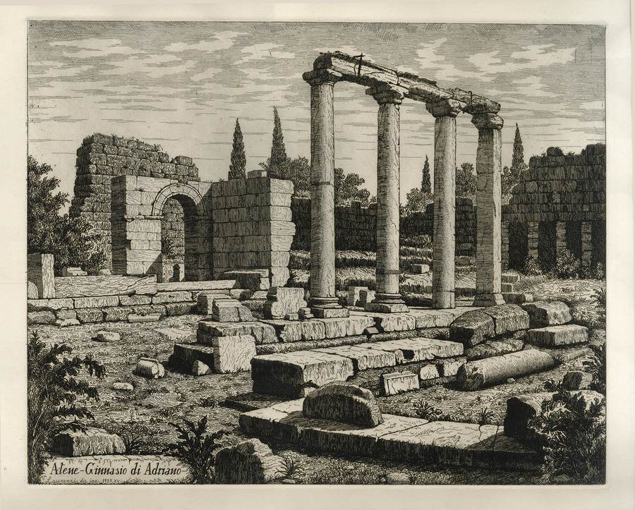sotto a sinistra: Atene - Ginnasio di Adriano / Laurenzi dis. inc. - 1937 - XV.