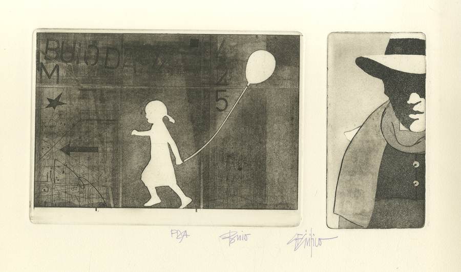 - Buio, 2013, Figura anonima, 2007, acquatinta, mm. 180x90 - La bambina con il palloncino..!, 2013, acquaforte + morsura diretta, 180x250, es. p.d.a.