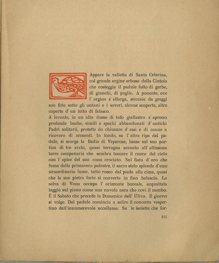 1915 - 112/149 - (37) Nel 1915 illustra con numerose xilografie il fascicolo speciale de L’Eroica dedicato a: La Crociata degli Innocenti, Mistero in quattro atti, Gabriele D’Annunzio, L’Eroica, La Spezia, anno V, fasc. VI-VII, ago.sett., Ornamenti di Emilio Mantelli, numero speciale. p. 111