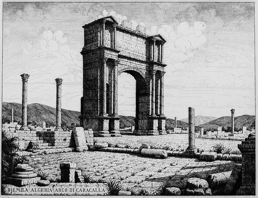 nell’inciso al centro: S. M. il Re Imperatore parte oggi per l’Ungheria / 18 maggio, sotto a sinistra: DJEMILA - ALGERIA - ARCO DI CARACALLA / Laurenzi inc. - 1937 - XV - a matita in basso a sinistra: Laurenzi, a destra I prova.