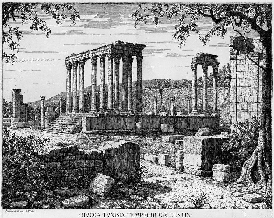 nell’inciso al centro: incisi / 2 Novem. 1938 / XVII / canaglia somaro / Laurenzi 1938 XVII, sotto a sinistra Laurenzi dis. inc. 1938 XVII - / DUCCA - TUNISIA - TEMPIO DI CAELISTIS