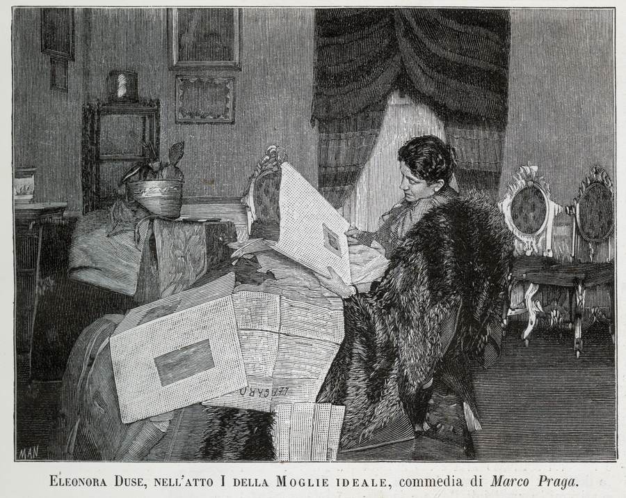 1891 - Eleonora Duse, nell'atto I della Moglie ideale, commedia di Marco Praga (Man), L'Illustrazione Italiana, Milano, Anno XVIII - 1° semestre, p. 21.