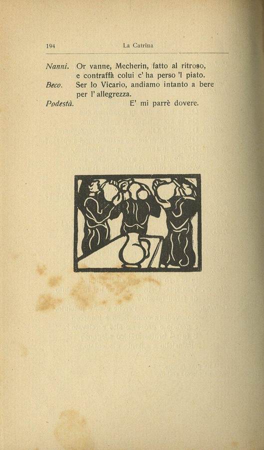 1915 - 150/164 -(15) Nel 1915 illustra con numerose xilografie il volume di Francesco Berni, Le Rime e la Catrina, A cura di Fernando Palazzi, con xilografie di Emilio Mantelli, edito da A: F. Formiggini a Genova, nella collana “Classici del Ridere (23). p. 194