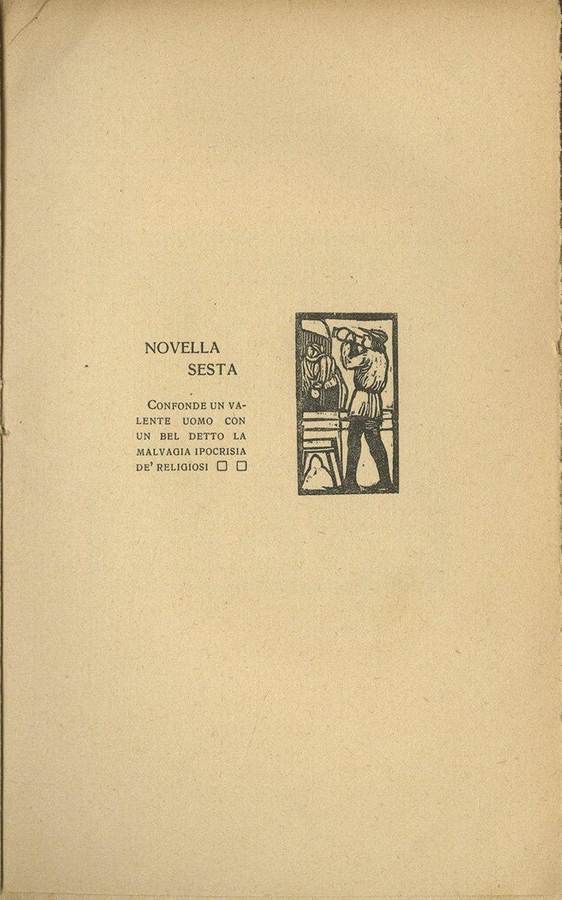 1913 - 8/60 - (53) Nel 1913 illustra con numerose xilografie il volume di Giovanni Boccacci,Il Decamerone, Pampinea - giornata prima, a cura di Ettore Cozzani, vol. I, Genova, A.F. Formiggini, xilografie di Emilio Mantelli. nella collana “Classici del Ridere (1)” p. 107