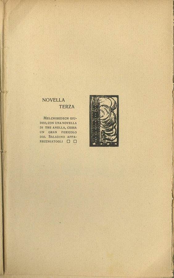 1913 - 8/60 - (53) Nel 1913 illustra con numerose xilografie il volume di Giovanni Boccacci,Il Decamerone, Pampinea - giornata prima, a cura di Ettore Cozzani, vol. I, Genova, A.F. Formiggini, xilografie di Emilio Mantelli. nella collana “Classici del Ridere (1)” p. 79