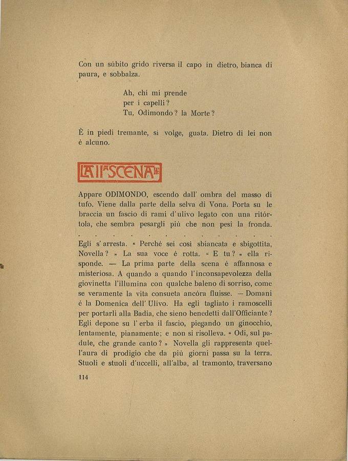 1915 - 112/149 - (37) Nel 1915 illustra con numerose xilografie il fascicolo speciale de L’Eroica dedicato a: La Crociata degli Innocenti, Mistero in quattro atti, Gabriele D’Annunzio, L’Eroica, La Spezia, anno V, fasc. VI-VII, ago.sett., Ornamenti di Emilio Mantelli, numero speciale. p. 114