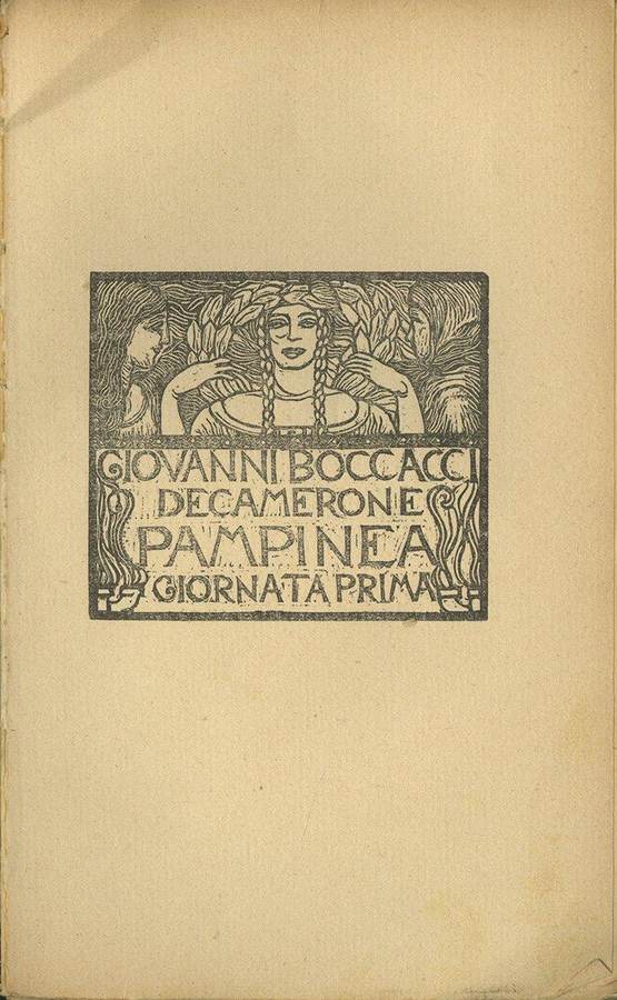 1913 - 8/60 - (53) Nel 1913 illustra con numerose xilografie il volume di Giovanni Boccacci,Il Decamerone, Pampinea - giornata prima, a cura di Ettore Cozzani, vol. I, Genova, A.F. Formiggini, xilografie di Emilio Mantelli. nella collana “Classici del Ridere (1)”. p. 1