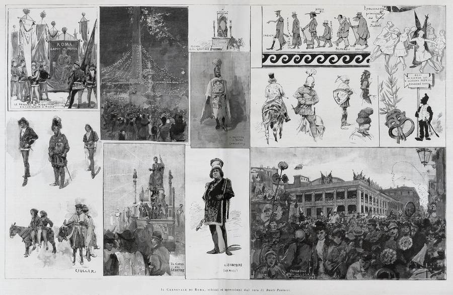 1891 - Il Carnevale di Roma, schizzi e impressioni dal vero di Dante Paolocci (MCS), L'Illustrazione Italiana, Milano, Anno XVIII - 1° semestre, pp. 120/121.