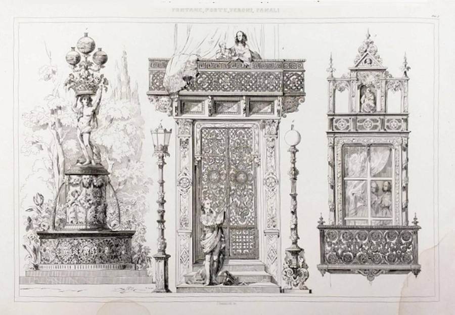 1851 - Industria Artistica o Raccolta di Composizioni e Decorazioni Ornamentali, come Suppellettili d’ogni maniera, tappezzerie, armature antiche, cristalli. vetri dipinti......., di Eugenio Julienne, ora per la prima volta oubblicata in Italia ...., Volume Unico, Venezia, Giuseppe Antonelli. tavv. 1, 4, 5, 8, 10, 13, 40, 47, 49, 70, 72, 73.