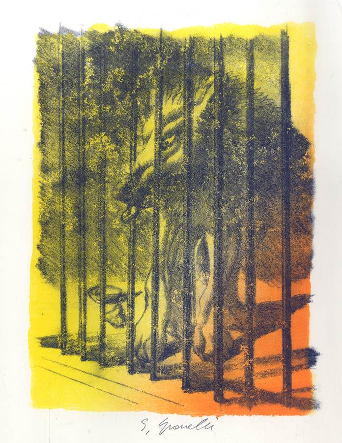 2023 - La prigione del lupo, 2023, litografia su pietra a matita, mm. 250x190, es. 83/83 (in: Vestire la Poesia - cartella ALI, Bologna - Stampatore: Laboratorio F.lli Manfredi, Reggio Emilia, Poesia di Fabrizio Dall’Aglio, Nel parco di Craiova)