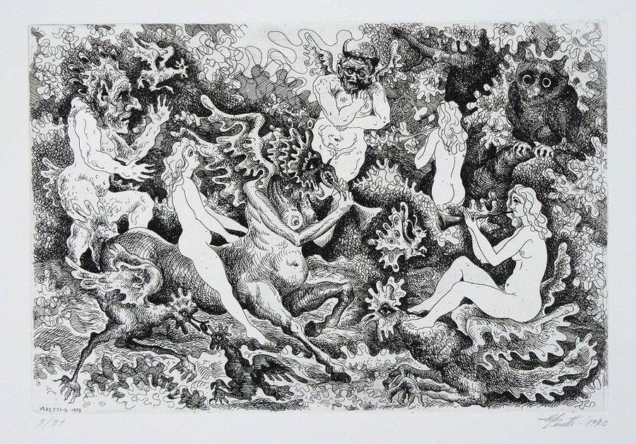 1971 - Giorgio Peretti. 5 acqueforti. Edizioni del Cappello, Verona, 1971, cartella tirata in Trentaquattro copie numerate da Uno a Trentuno e da Prima a Terza, mm. 295x440, esemplare: 9/31.
