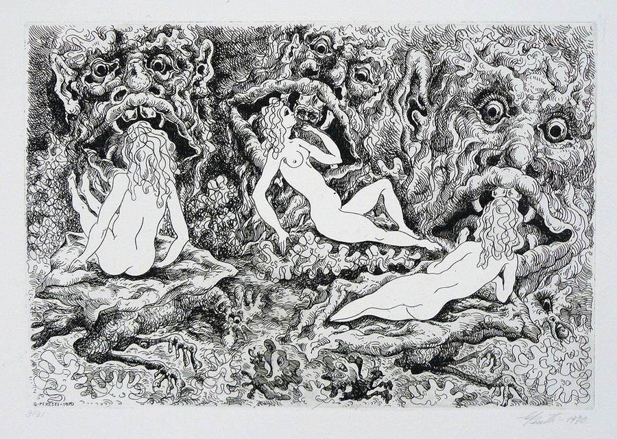 1971 - Giorgio Peretti. 5 acqueforti. Edizioni del Cappello, Verona, 1971, cartella tirata in Trentaquattro copie numerate da Uno a Trentuno e da Prima a Terza, mm. 295x440, esemplare: 9/31.