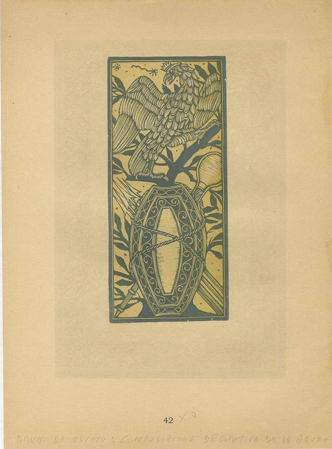 1929, Cesare Ratta, “L’Incisione orignale su legno in Italia”, 300 tavole xilografiche, Prefazione di Luigi Servolini Bologna, xilografie originali:- Numerose xilografie di pagine e fregi tolti dall’opera: Le Aquile Feltresche del Palazzo Ducale di Urbino”, p. 42