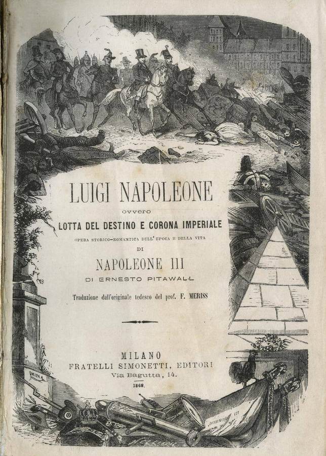 1868 - Ernesto Pitawall. Luigi Napoleone ovvero Lotta del destino e corona Imperiale. Opera storico-romantica dell’epoca e della vita di Napoleone III. di E. P., Milano, fratelli Simonetti Editori, frontespizio