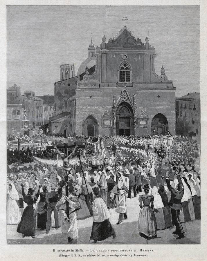 1894 - Il terremoto in Sicilia - La grande processione di Messina, (disegno di E. X. ...) (Cant. Zano. inc.), L'Illustrazione Italiana, Milano, Anno XXI - 2° semestre, p. 353.