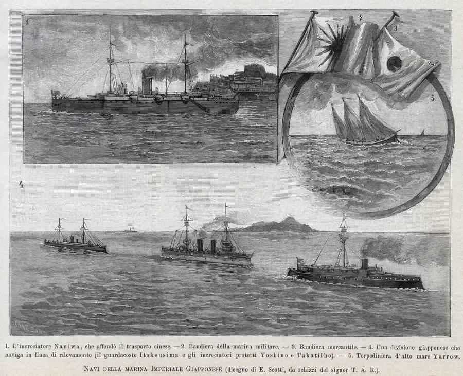 1894 - Navi della Marina Imperiale Giapponese (disegno di E. Scotti, ...) (Cant. Zano. inc.), L'Illustrazione Italiana, Milano, Anno XXI - 2° semestre, p. 109.