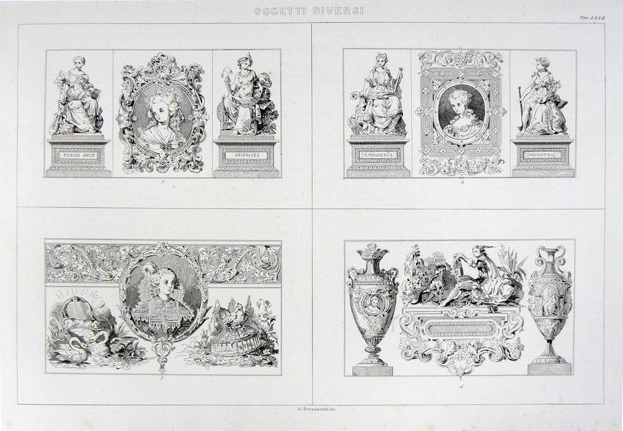 1851 - Industria Artistica o Raccolta di Composizioni e Decorazioni Ornamentali, come Suppellettili d’ogni maniera, tappezzerie, armature antiche, cristalli. vetri dipinti......., di Eugenio Julienne, ora per la prima volta oubblicata in Italia ...., Volume Unico, Venezia, Giuseppe Antonelli. tavv. 1, 4, 5, 8, 10, 13, 40, 47, 49, 70, 72, 73.