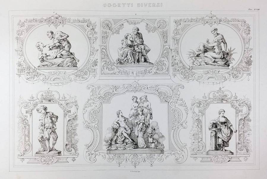 1851 - Industria Artistica o Raccolta di Composizioni e Decorazioni Ornamentali, come Suppellettili d’ogni maniera, tappezzerie, armature antiche, cristalli. vetri dipinti......., di Eugenio Julienne, ora per la prima volta oubblicata in Italia ...., Volume Unico, Venezia, Giuseppe Antonelli. tavv. 3, 7, 9, 14, 18, 21, 28, 32, 44, 62, 63, 67, 71.