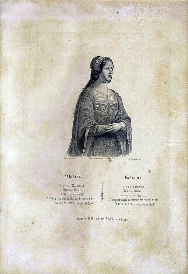 - Parisina. Figlia di Malatesta Signora di Rimini Moglie di Nicolò III. effige presa dai ritratti de Principi d’este, illustrati da Antonio Cariola mel 1640 (G. Domenichini dis., Torino, Lit. Giordana, Grand Didier e Salussolia, C. Grand Didier lit.), Ferrara, 1855, Abram Servadio editore.