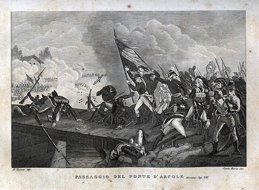 1855 c. - De Norvins, “Storia di Napoleone e del grande esercito”, Milano, Francesco Pagnoni.111 - Passaggio del ponte d’Arcole (H. Vernet dip., Santa Maria inc); p. 90