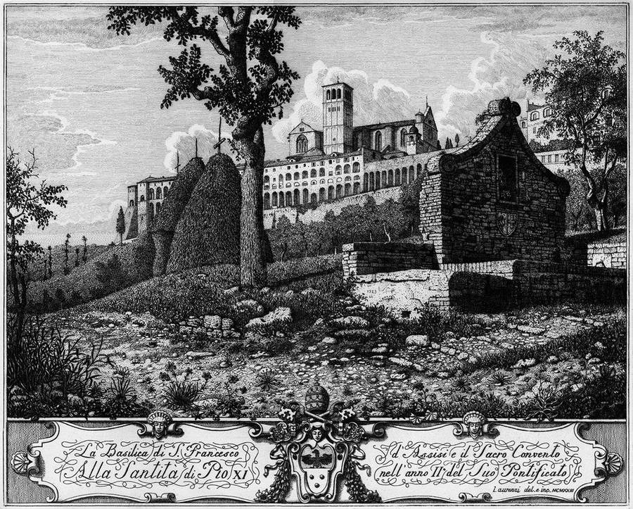 nell’inciso al centro 1923 / LL / Laurenzi in Assisi 1923 sotto La Basilica di S. Francesco d’Assisi e il Sacro Convento / Alla Santità di Pio XI nell’Anno II° del Suo Pontificato / Laurenzi del. e inc. MCMXXIII, a matita sotto a sinistra Laurenzi all’amico A. Giuganino, a destra Prova I.