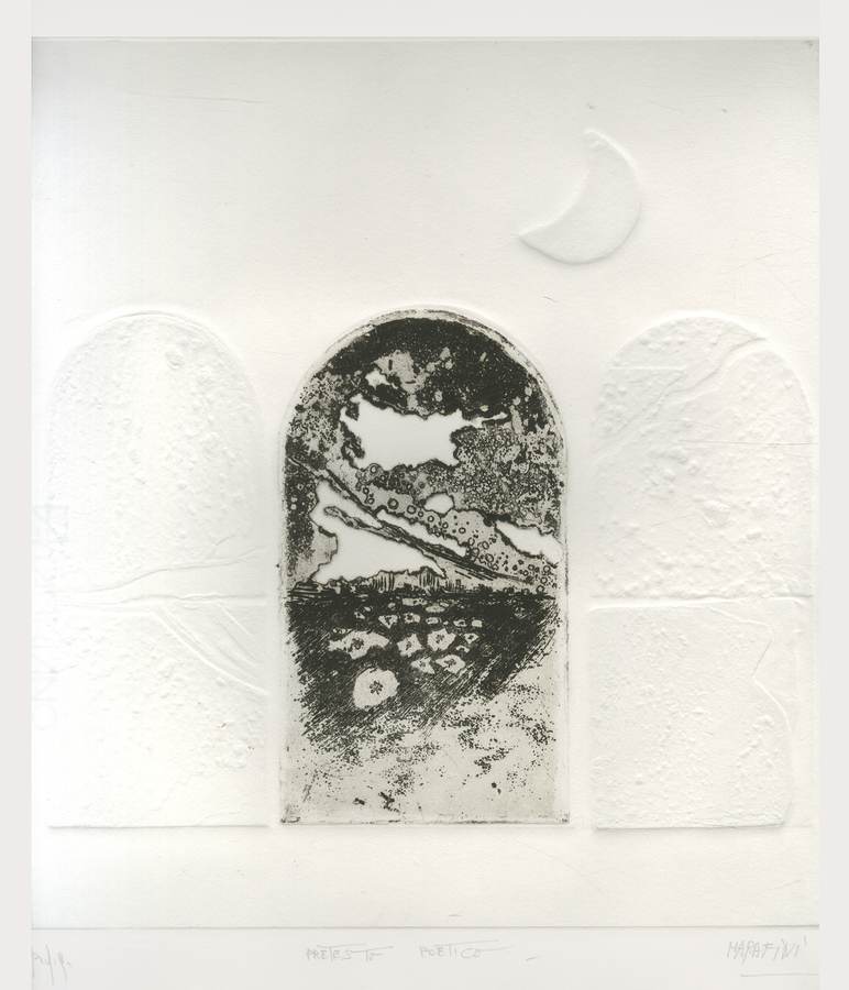 4 - Pretesto poetico, 2022, acquaforte, puntasecca, impressione a secco, mm. 345x320, es. p.d.a. (dalla cartella: Il paesaggio, il sogno, il mito, sei incisori in terra pontina, Comel Edizioni.