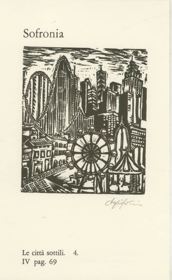 2022 - Le città invisibili, 11 artisti rendono omaggio a Italo Calvino, (Ettore Antonini - Alessia Baraldi - Gregorio Bellodi - Paolo Cabrini - Giovanni Daprà - Edoardo Fontana - Vittorio Giacopini - Luigi Maiocchi - Daniele Roberto Milani - Lucio Passerini - Luciano Ragozzino), raccolta di 55 xilografie con tiratura di 75 esemplari autografati su carta Century Cotton Wove White e 75 esemplari senza firma stampati su carta Cottage Ivory. Museo della stampa e stampa d’arte a Lodi, esemplare: 30/75.