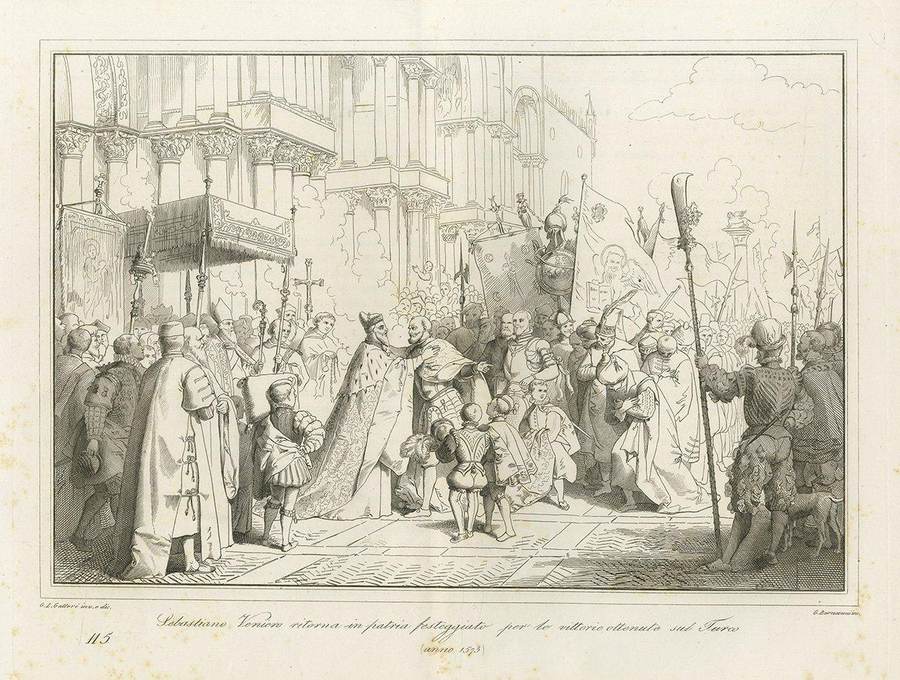 1863 - Storia Veneta espressa in centocinquanta tavole inventate e disegnate da Giuseppe Gatteri ...., incise da Antonio Viviani e dai migliori artisti veneziani, ed illustrate da Francesco Zanotto. Seconda Edizione. Venezia, Giuseppe Grimaldo tipografo e calcografo, tavv.: 86, 92, 97, 100, 105, 115, 119, 122, 126, 131, 139, 143, 147, 150.