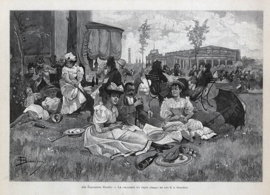 1894 - Alle Esposizioni Riunite - La colazione sui prati (disegno dl vero di A. Bianchini) (Cant. Zano. inc.), L'Illustrazione Italiana, Milano, Anno XXI - 2° semestre, p. 184.