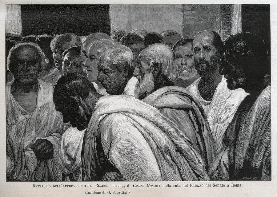 1891 - Dettaglio dell'affresco "Appio Claudio cieco" di Cesare Maccari nella sala del Palazzo del Senato a Roma (incisione di G. Sabattini), L'Illustrazione Italiana, Milano, Anno XVIII - 1° semestre, p. 129.