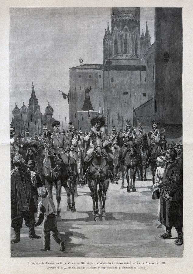 1894 - I funerali di Alessandro III a Mosca - Gli araldi annunzio l'arrivo della salma di Alessandro III, (disegno di E. X. ...) (Cant. Zano. inc.), L'Illustrazione Italiana, Milano, Anno XXI - 2° semestre, p. 341.