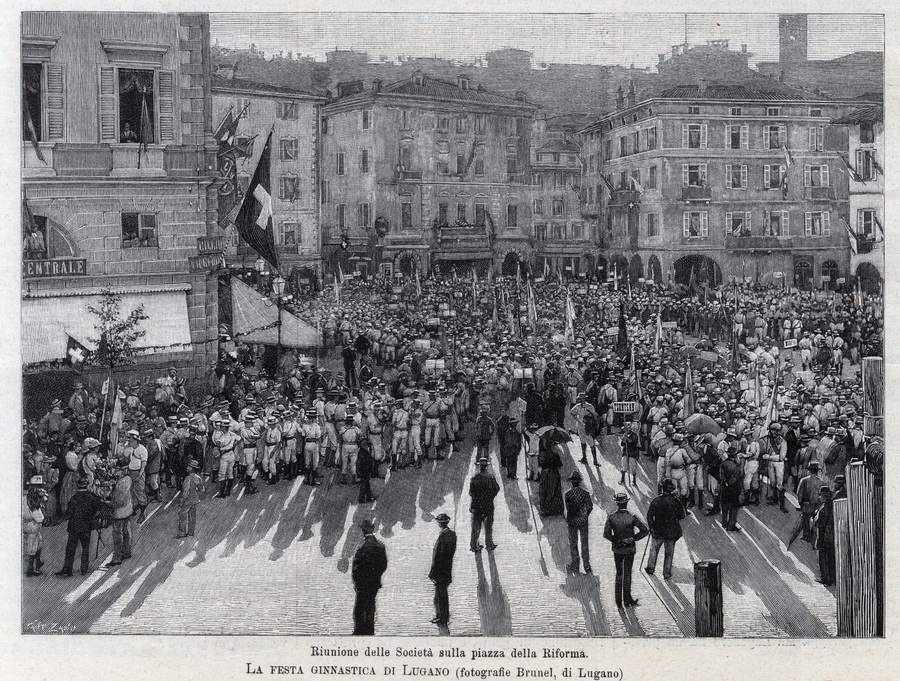 1894 - La festa ginnastica di Lugano - Riunione delle Società sulla piazza della Riforma (Cant. Zano. inc.), L'Illustrazione Italiana, Milano, Anno XXI - 2° semestre, p. 116.