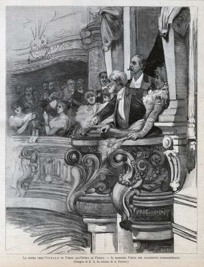 1894 - La prima dell'Otello di Verdi all'Opèra di Parigi - Il maestro Verdi nel palchetto presidenziale (disegno di E. X. ...) (Cant. Zano. inc.), L'Illustrazione Italiana, Milano, Anno XXI - 2° semestre, p. 257.