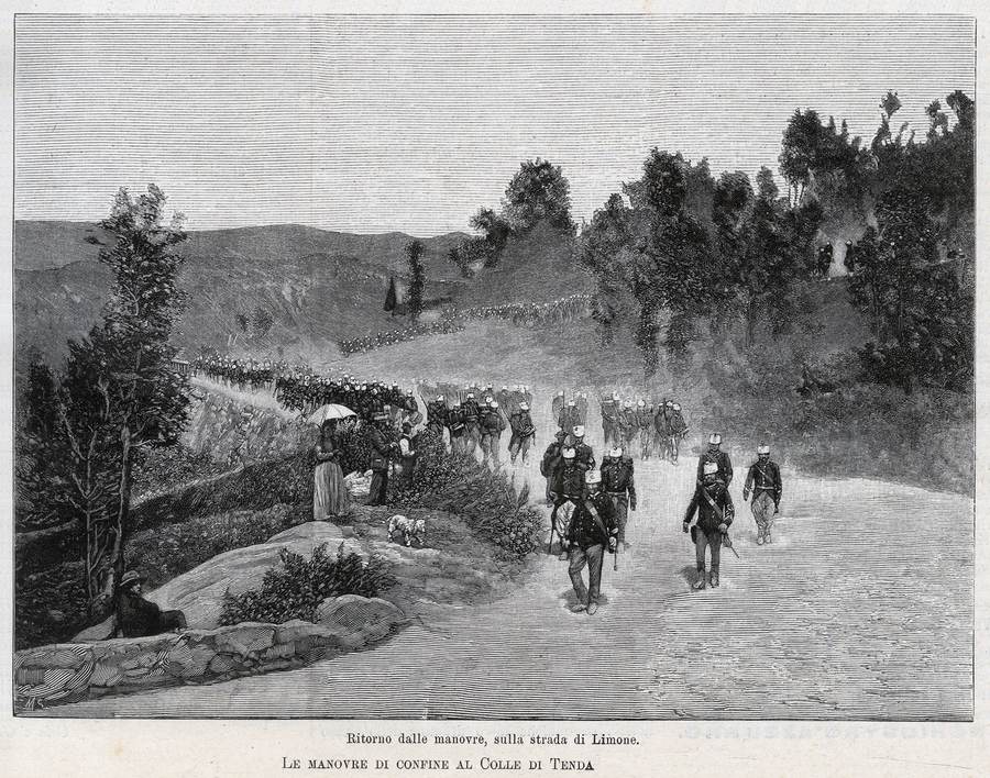 1894 - Le manovre di confine al Colle di Tenda - Ritorno dalle manovre, sulla strada di Limone (M. S. inc.), L'Illustrazione Italiana, Milano, Anno XXI - 2° semestre, p. 113.