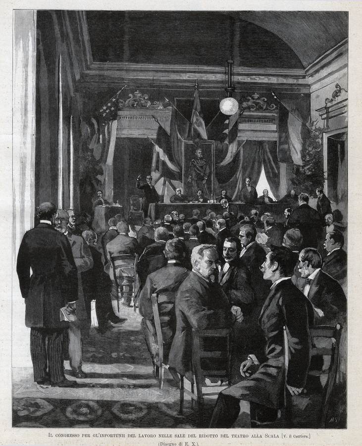 1894 - Il Congresso per gli infortunii del lavoro nelle sale del ridotto del Teatro alla Scala, (disegno di E. X.) (M. S. inc.) L'Illustrazione Italiana, Milano, Anno XXI - 2° semestre, p. 241.