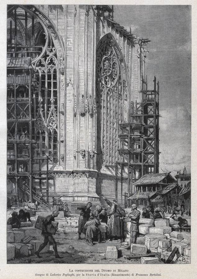 1894 - La costruzione del Duomo di Milano (disegno di Lodovico Pogliaghi) (Cant. Zano. inc.), L'Illustrazione Italiana, Milano, Anno XXI - 2° semestre, p. 81.