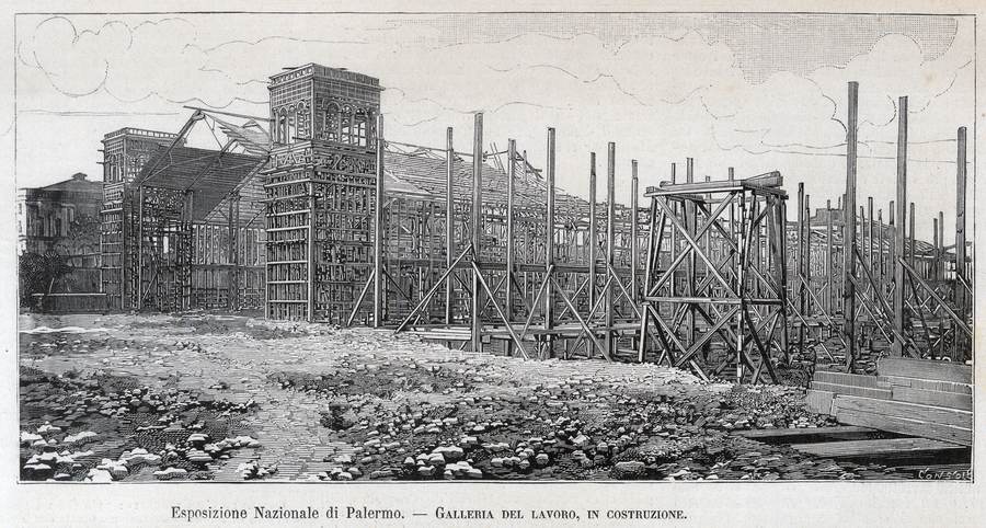 1891 - Esposizione Nazionale di Palermo - Galleria del lavoro, in costruzione (Incisione di B. Console), L'Illustrazione Italiana, Milano, Anno XVIII - 1° semestre, p. 12.