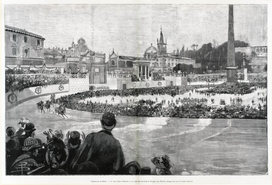 1891 - Carnevale di Roma..... (disegno dal vero di Dante Paolocci, Sabattini), L'Illustrazione Italiana, Milano, Anno XVIII - 1° semestre, pp. 104/105.